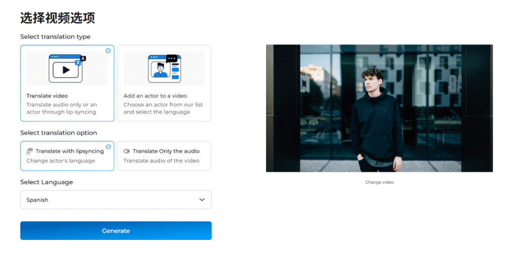 上传视频后,您需要从我们丰富的头像库中选择合适的头像进行转换。选择是否使用头像后,您需要决定是否使用我们先进的 AI 唇形同步技术™,或者是否只翻译音频。